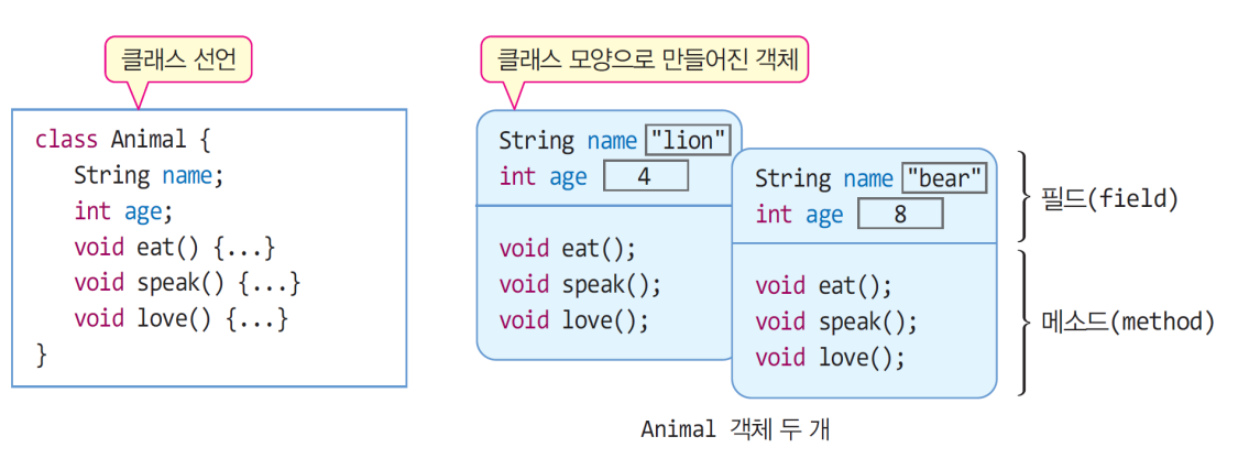 - 클래스(class) : 객체 모양을 선언한 틀( 캡슐화 ), 메소드(멤버함수)와 필드(멤버 변수)는 모두 클래스 내에 구현