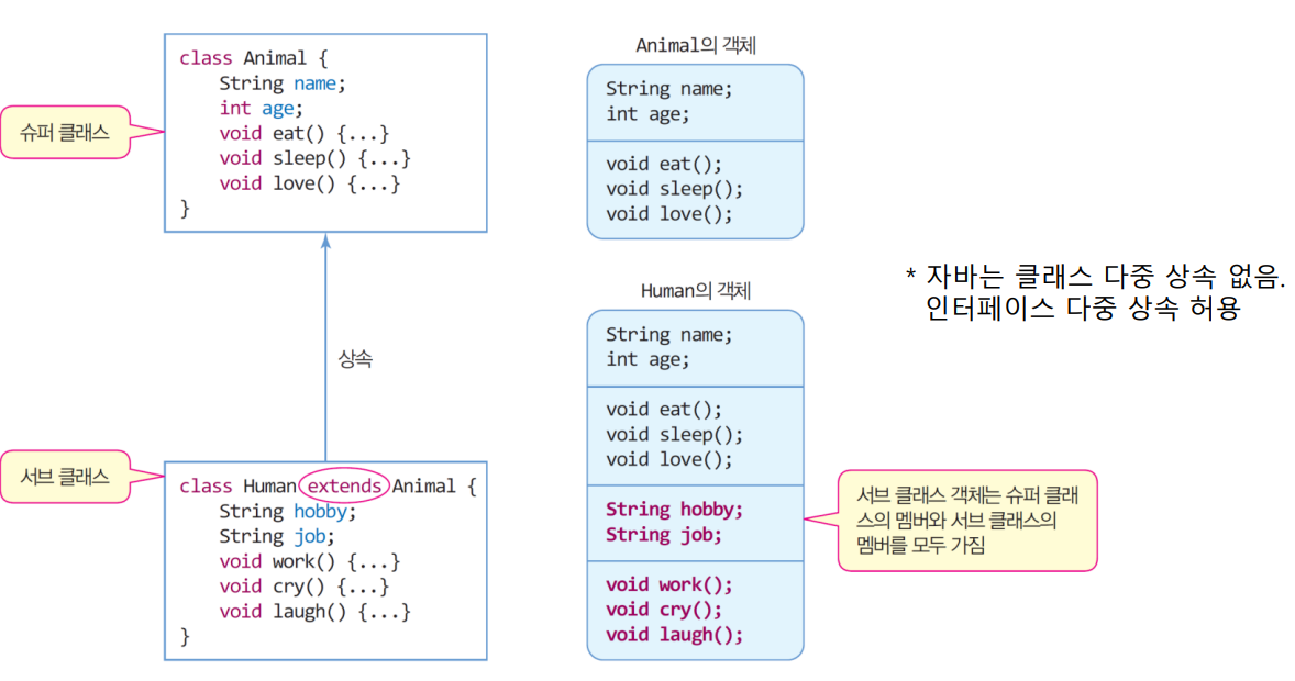 상위 객체는 자기가 가지고 있는 필드와 메서드를 하위 객체에게 물려주어 하위 객체가 사용할 수 있도록 해준다.