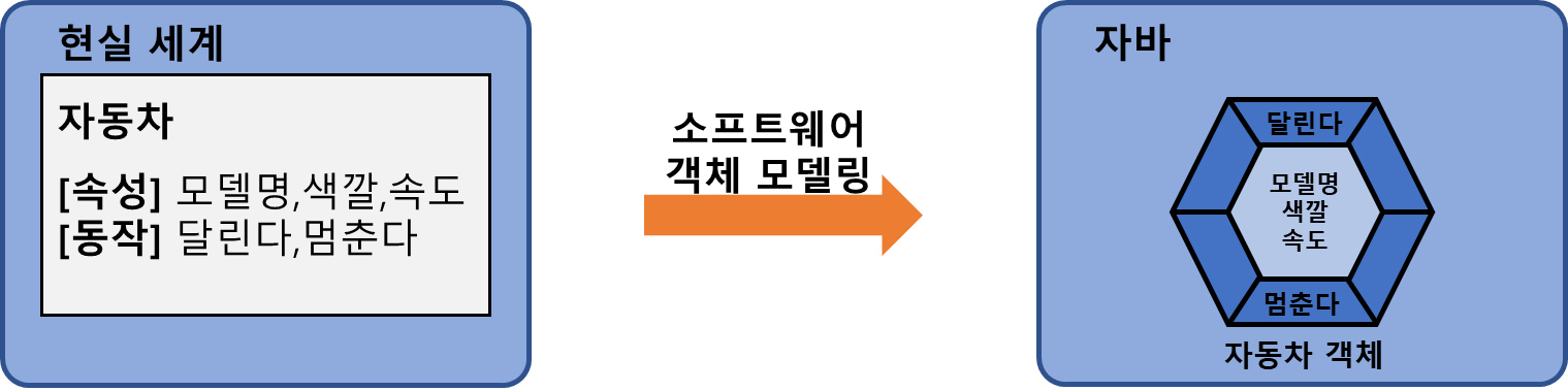 자동차는 모델명, 색깔, 속도 등의 속성을 가지고 있다