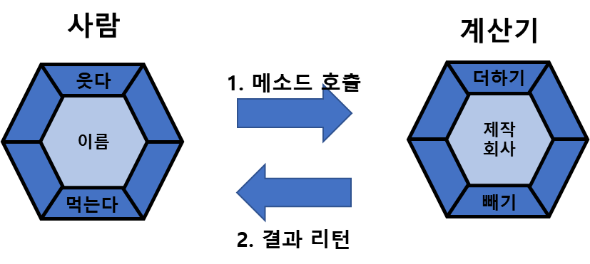 객체는 다른 객체의 메서드를 호출하여 원하는 결과를 얻어낸다.