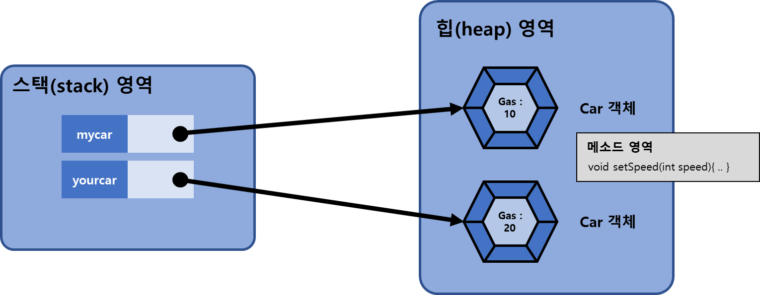 인스턴스 필드는 객체마다 따로 존재하고, 인스턴스 메소드 setSpeed()는 객체마다 존재하지 않고 메소드 영역에 저장되고 공유한다.