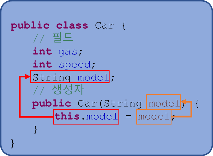 객체 외부에서 인스턴스 멤버에 접근하기 위해 참조 변수를 사용하는 것과 마찬가지로 객체 내부에서도 인스턴스 멤버에 접근하기 위해 this를 사용할 수 있다.
