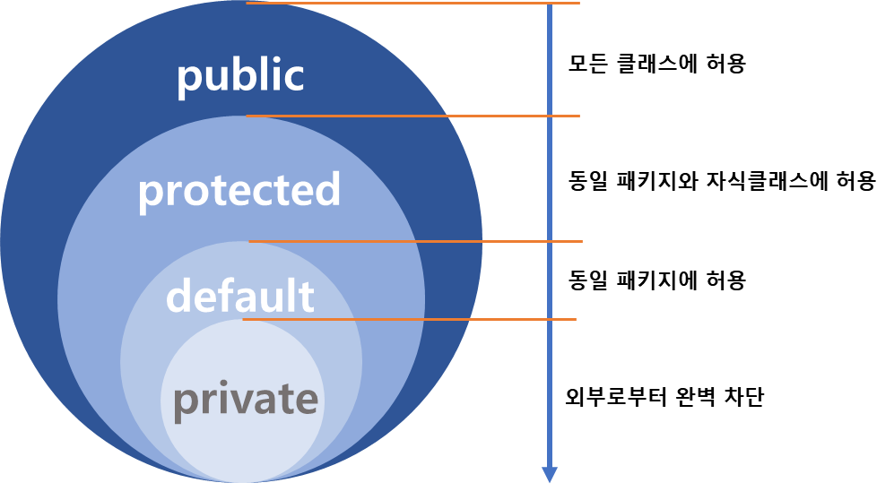 | private | 필드,생성자,메소드 | 모든 외부 클래스 |