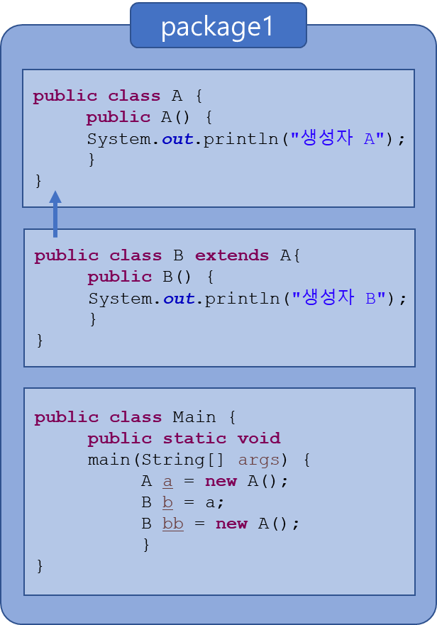 ![]() a와 b,bb 변수는 타입만 다를 뿐 동일한 A 객체를 참조한다. |