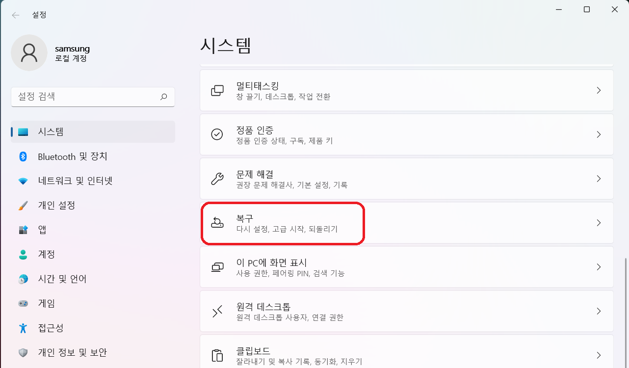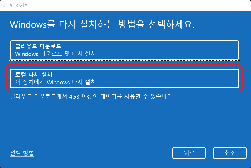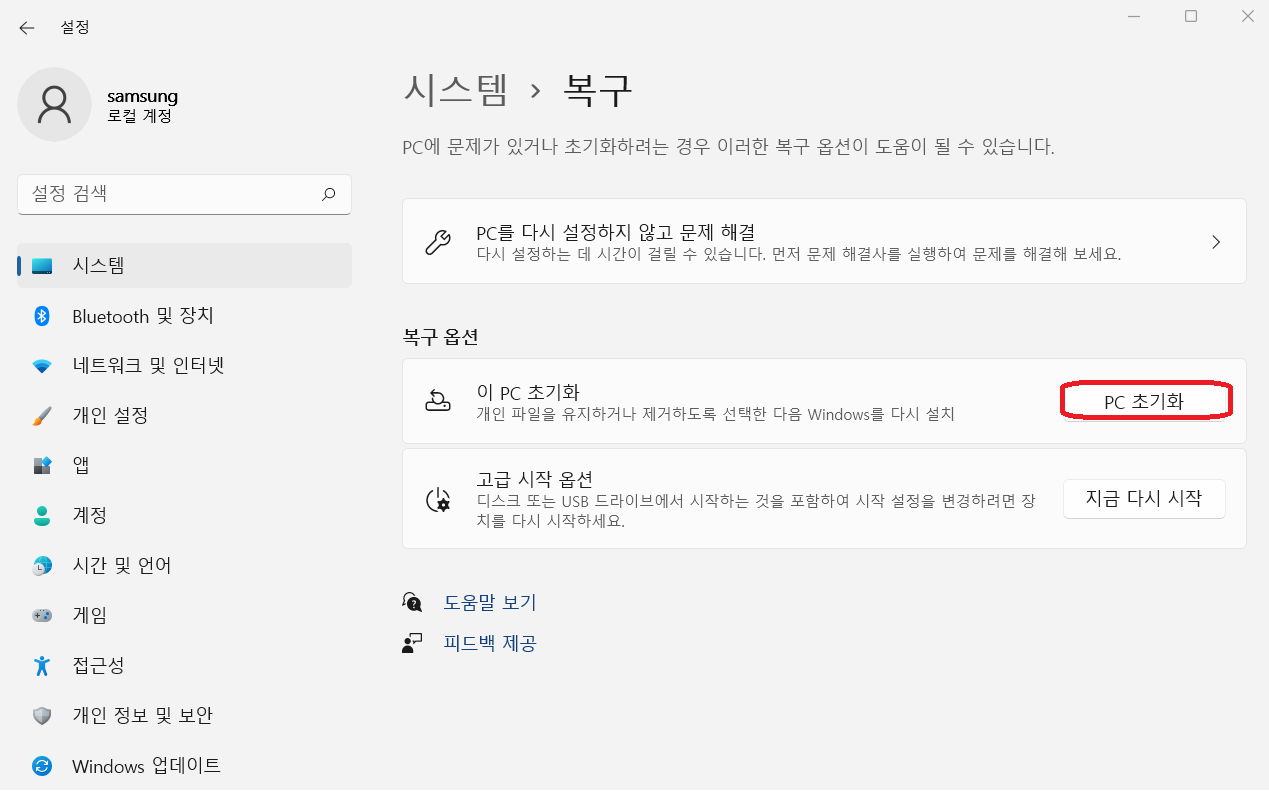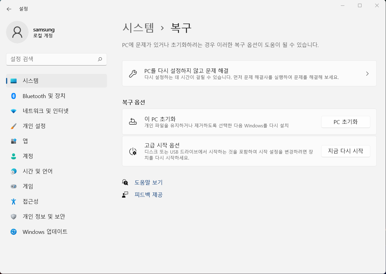 - 로컬에서 다시 설치 : winodw11을 다시 설치