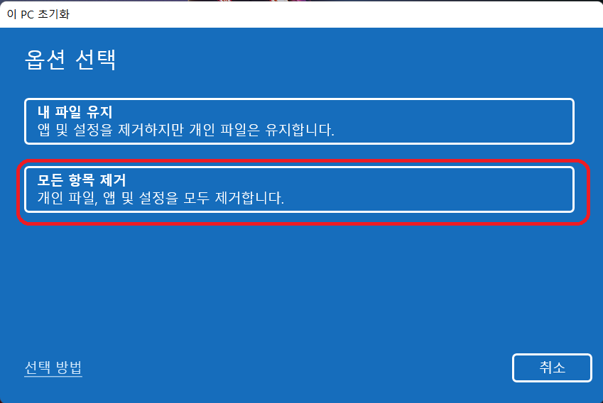 - 모든 항목 제거 : 앱, 개인설정, 개인 파일 모두 제거( 노트북이나 PC를 중고로 판매할 경우 선택 )