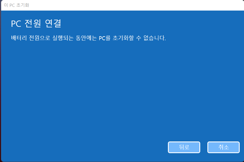 6. "배터리 전원으로 실행되는 동안에는 PC를 초기화할 수 없습니다."