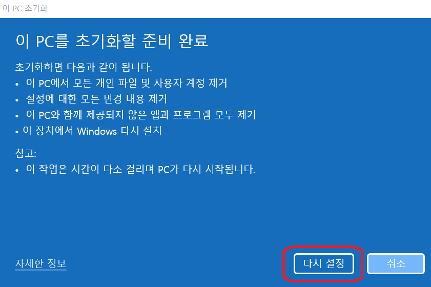 6. PC초기화할 준비 완료 다시 설정 클릭