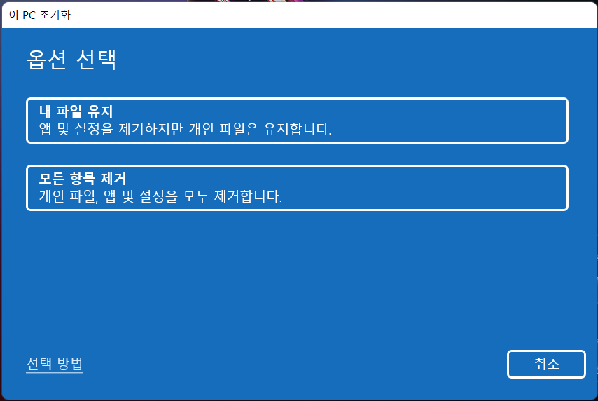 - 내 파일 유지 : 앱 및 설정을 제거하지만 개인적인 파일을 유지