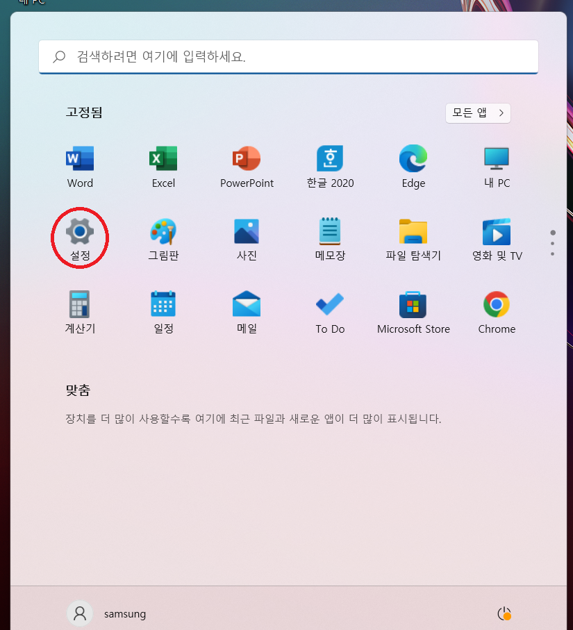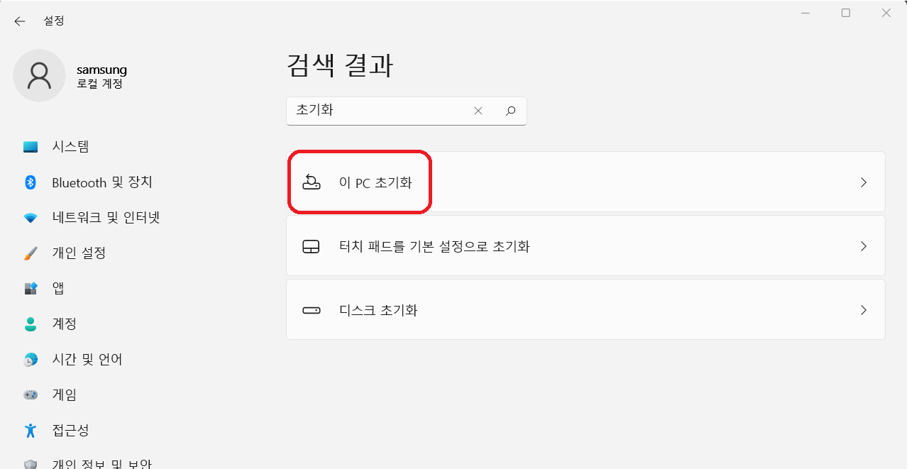 - 설정 검색에서 초기화 검색