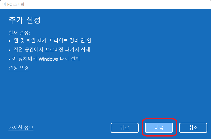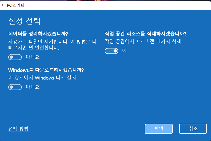 즉, 윈도우 11을 새것 같은 상태를 원할 때 선택