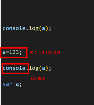 console.log(a); // 오류가 예상된다. 하지만 호이스팅에 의해 선언 및 초기화 undefined