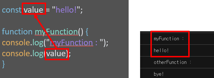 이때 Global scope인 const value="hello!"; 와 Function scope인 const value = "bye!";에는 아무런 영향을 주지 않는다.