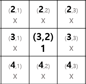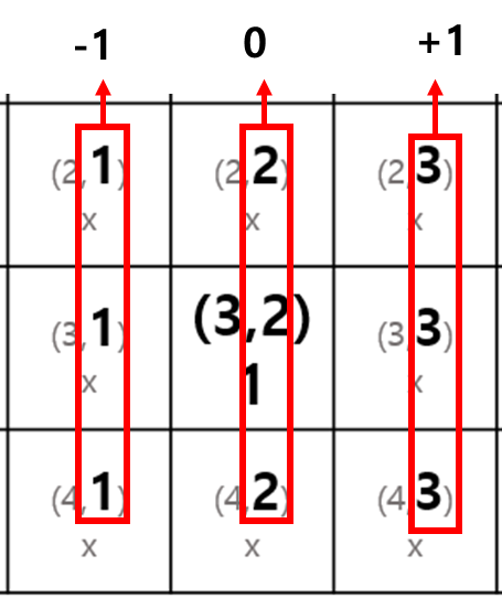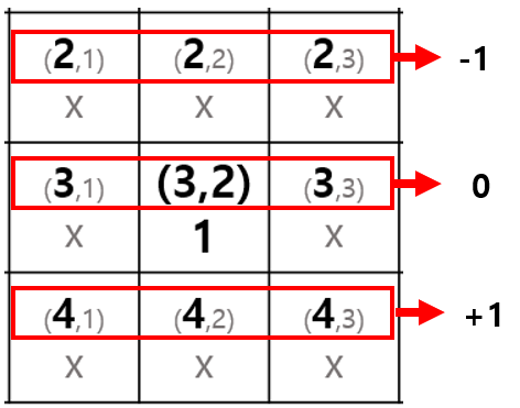 이 때 지뢰가 있는 (3,2)를 기준으로 열은 -1,0,+1,-1,0,+1,-1,0,+1 위험지대 위치이다.