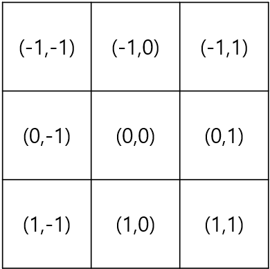 지뢰의 위치(0,0)를 기준으로 2차원 배열을 x,y좌표로 표현하여 위험지대의 위치는 (-1,-1),(-1,0),(-1,1),(0,-1),(0,1),(1,-1),(1,0),(1,1)로 총 8방향이 나오는 것을 알 수 있다.
