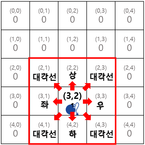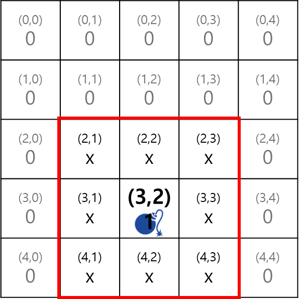 이 때 지뢰가 있는 (3,2)를 기준으로 행은 -1,-1,-1,0,0,+1,+1,+1 위험지대 위치이다.