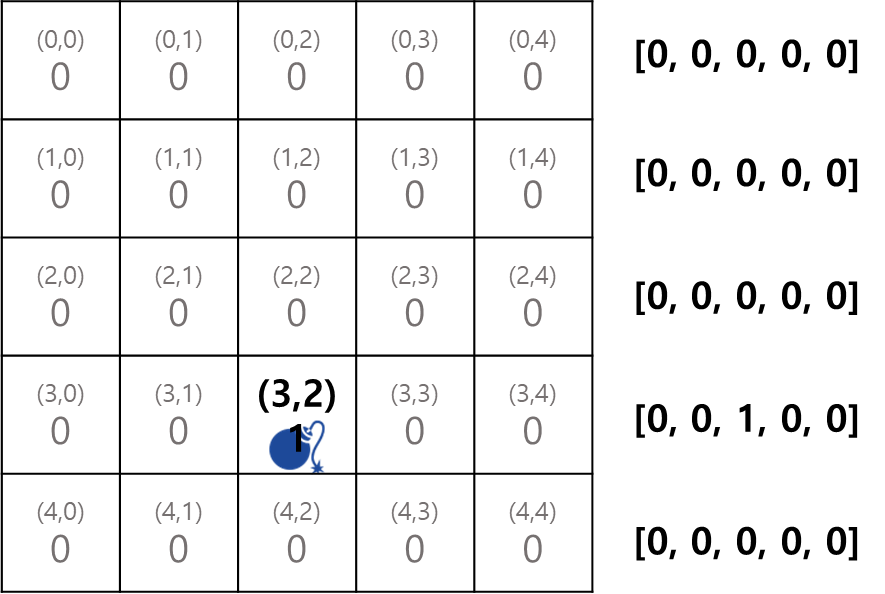 입출력 1번의 2차원 배열은 [[0, 0, 0, 0, 0], [0, 0, 0, 0, 0], [0, 0, 0, 0, 0], [0, 0, 1, 0, 0], [0, 0, 0, 0, 0]] 이다. 지뢰는 (3,2)의 위치에 있다.