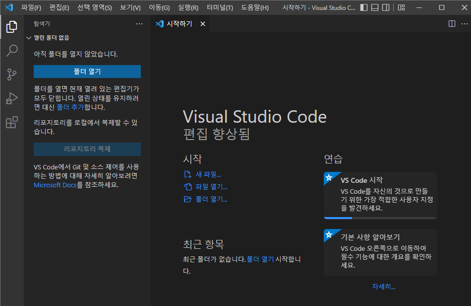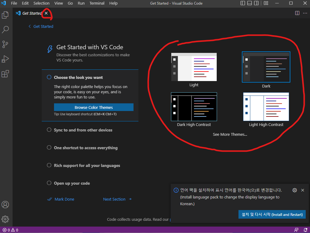 1. 설치한 VSCODE를 실행 후 원하는 태마 설정 또는 X 클릭