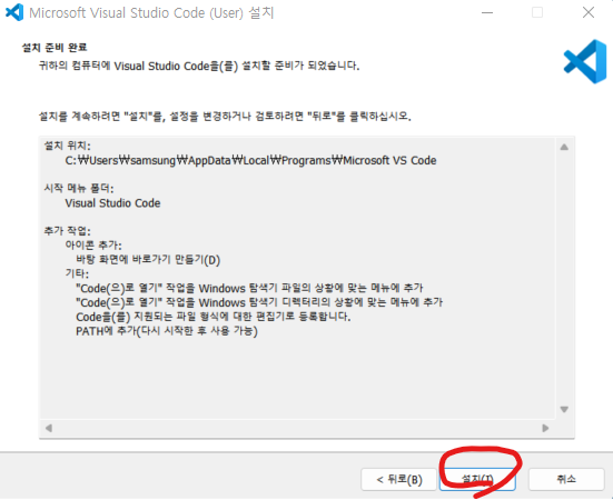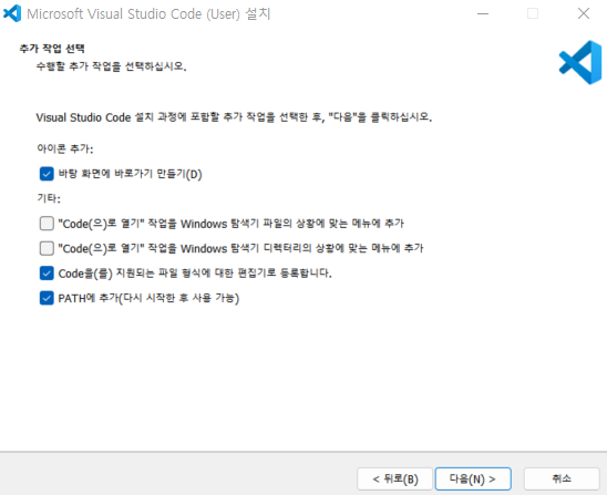- PATH에 추가(다시 시작한 후 사용 가능) : 명령창(CMD)에서 code를 입력하면 VSCode 실행