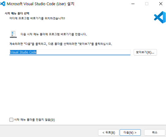 - 시작 메뉴 만들기를 원하지 않을 경우 왼쪽 하단의 '시작 메뉴 폴더를 만들지 않음' 선택 후 다음 클릭