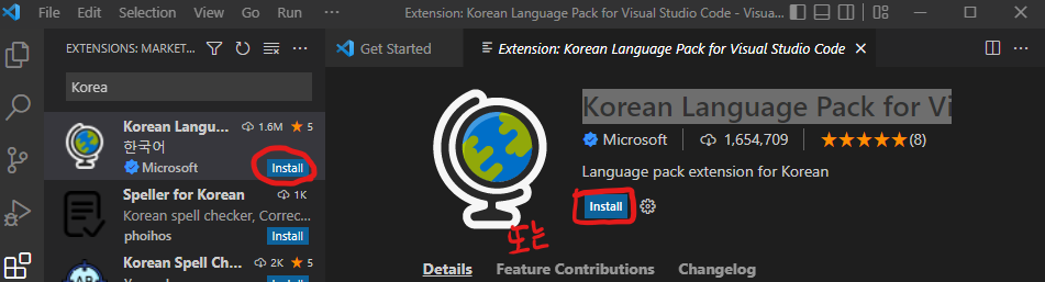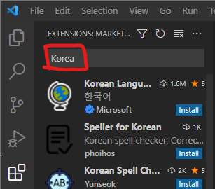 4. 검색 결과 목록 중 "Korean Language Pack for Visual Studio Code" 설치