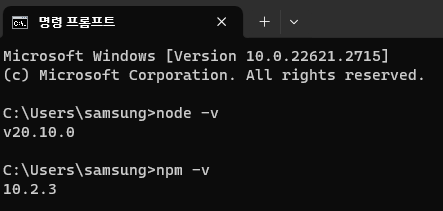 명령어 프롬프트(CMD)에서 명령어를 입력해 올바르게 설치되었는지 확인한다.