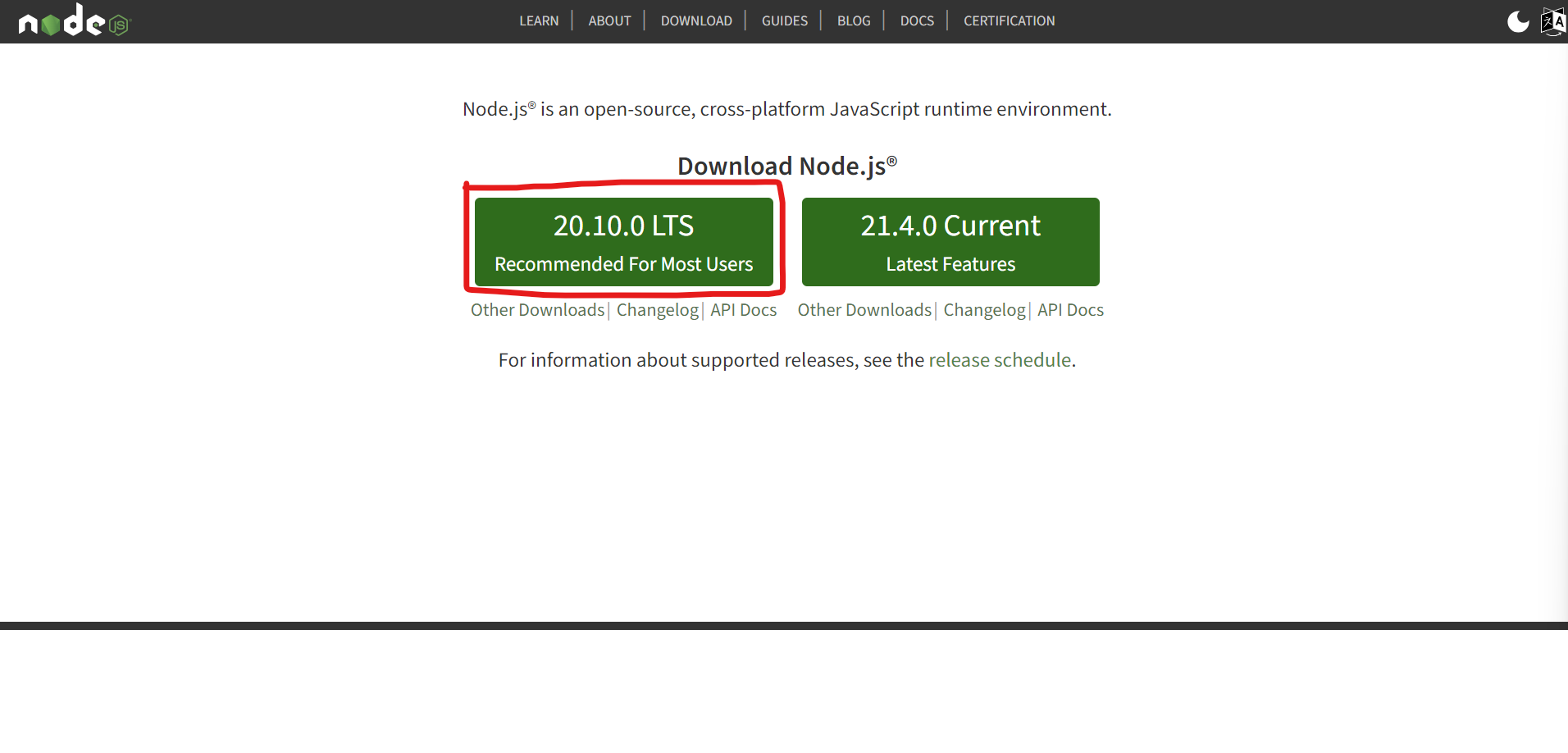 LTS : 기업을 위해 3년간 지원하는 버전이다. 짝수 버전만 LTS 버전이 될 수 있다. 서버를 안정적으로 운영해야 할 경우 선택한다. 하지만 최신 기능을 사용하지 못할 수 있다.