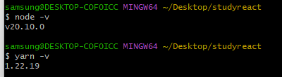 node.js와 yarn이 잘 설치되었는지 확인하기 위해 명령어를 입력한다.