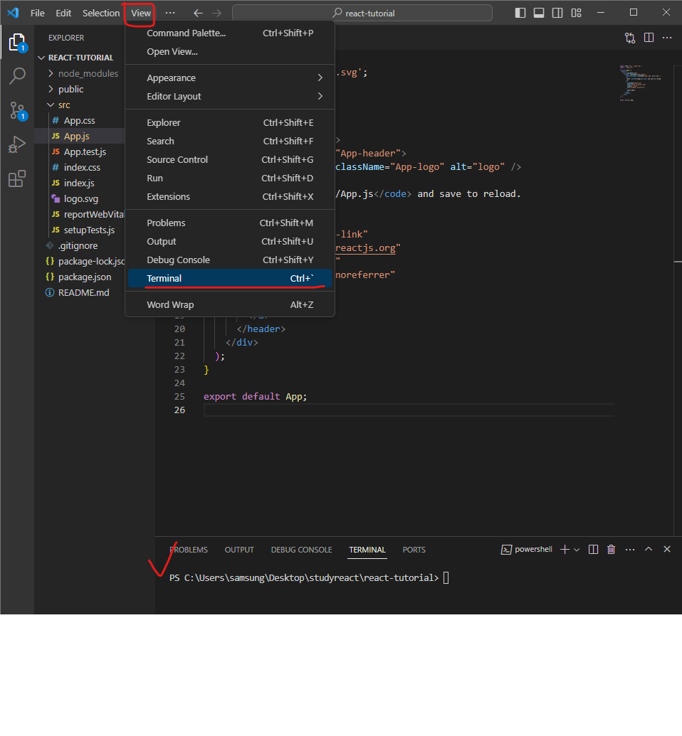 vscode 상단에 View > Terminal (보기> 터미널)을 클릭하면 vscode 내부에서 터미널을 사용할 수 있다.