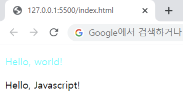 | <!DOCTYPE HTML> <html> <head> <meta charset="utf-8"> <style> p{ color: aqua; } </style> </head> <body> <p> Hello, world!</p> <script> document.write("Hello, Javascript!"); </script> </body> </html> |