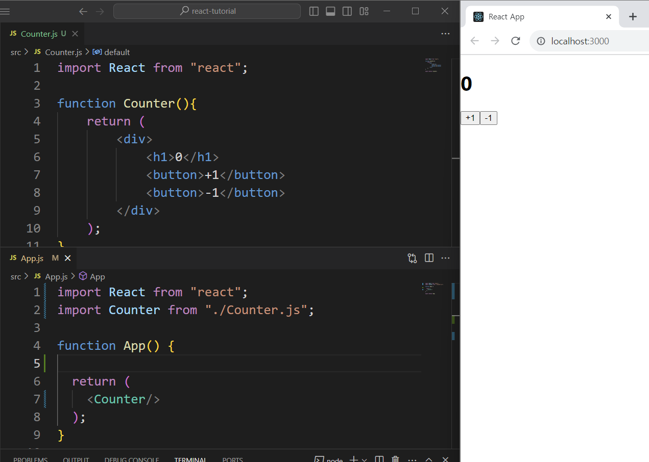Counter.js에서 버튼이 클릭되는 이벤트가 발생했을 때, 특정 함수가 호출되도록한다.