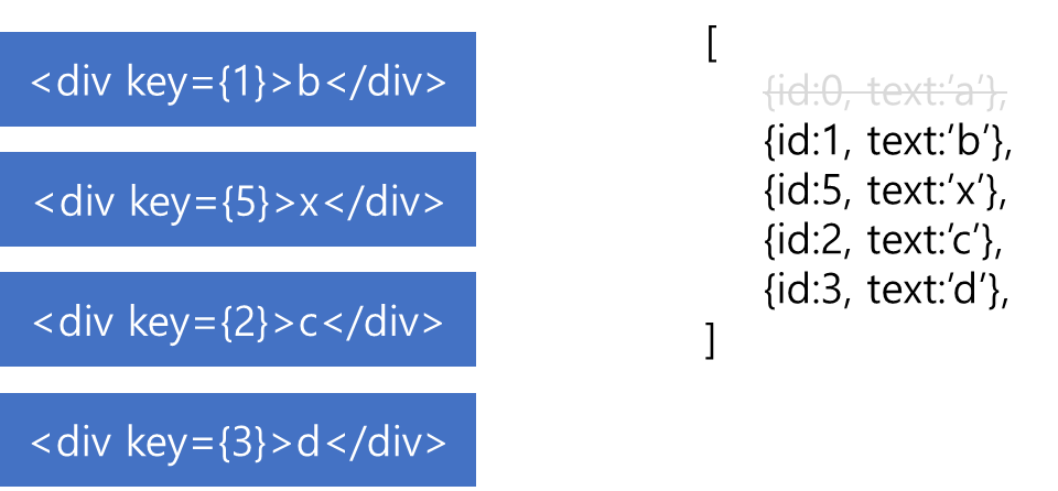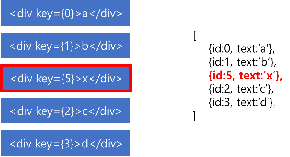 만약 {id:5,text:'x'}가 추가된다면 매우 효율적으로 업데이트된다.