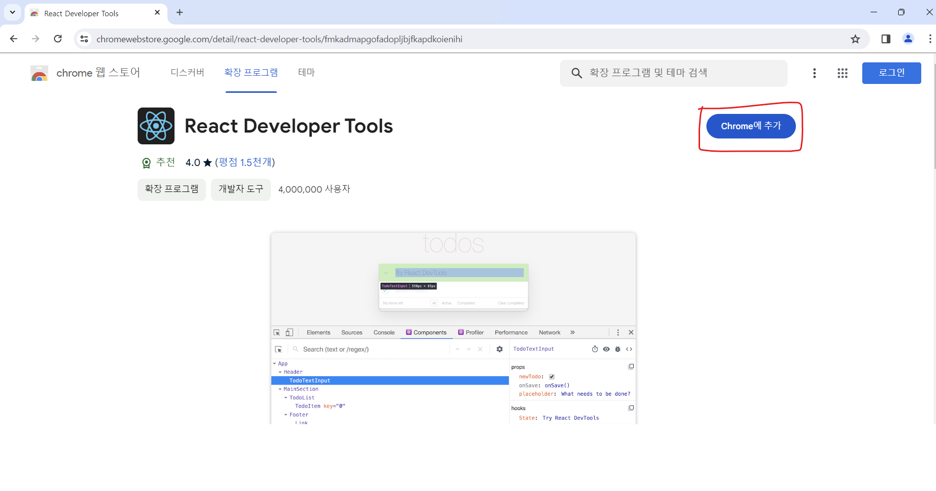 크롬 웹 스토어에서 " React Developer Tools " 를 설치한다. [바로가기]