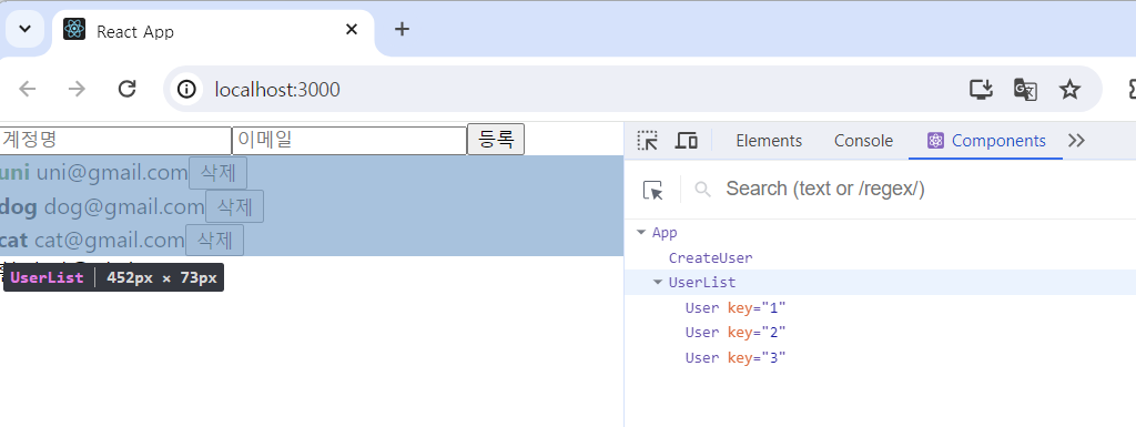 >>를 클릭한 후 components를 클릭하면 react 컴포넌트에 대한 정보가 나온다.
