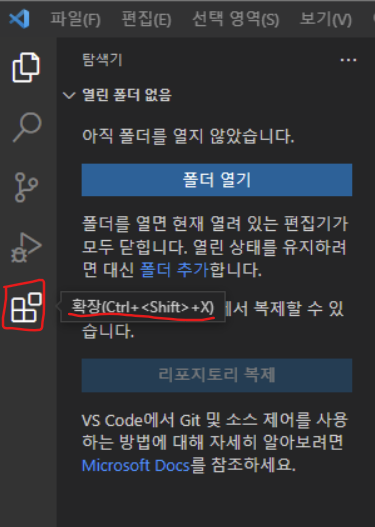 1. VSCODE 왼쪽 메뉴에서 아래에 있는 확장( = Extensions 또는 단축키 Ctrl + Shift + X ) 클릭