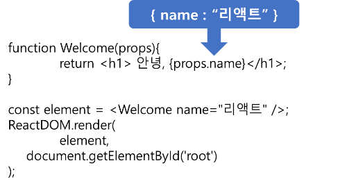 const element = <Welcome name="리액트" />; : 속성이 name, 값이 "리액트"를 가진 element를 파라미터로 해서
