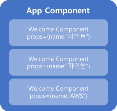 App Component 안에 3개의 Welcome Component가 있고 각각의 Welcome Component는 각기 다른 props를 가지고 있다.