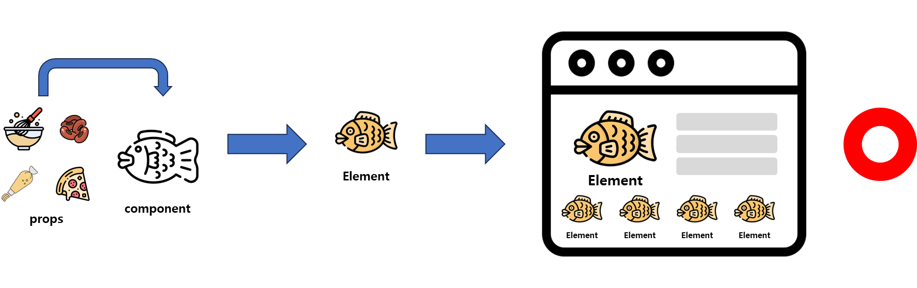 Component라는 붕어빵 틀을 통해 찍어 나온 element라는 붕어빵이 실제로 화면에 나오게 된다.