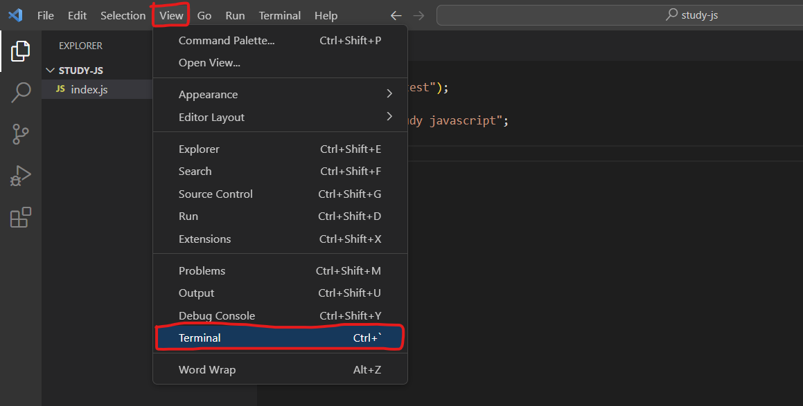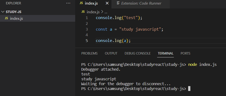 - 내장 터미널에서 자바스크립트 실행하기
