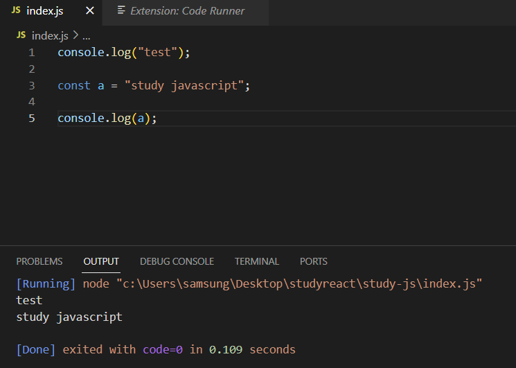 node.js를 설치한 후 명령어 node index.js를 입력하면 자바스크립트가 실행된다.