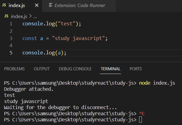 이 게시글은 vscode 내장 터미널에서 자바스크립트를 실행하는 방법이다.