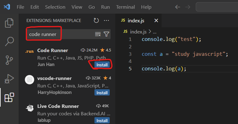 검색창에 code runner 검색 후 install 클릭