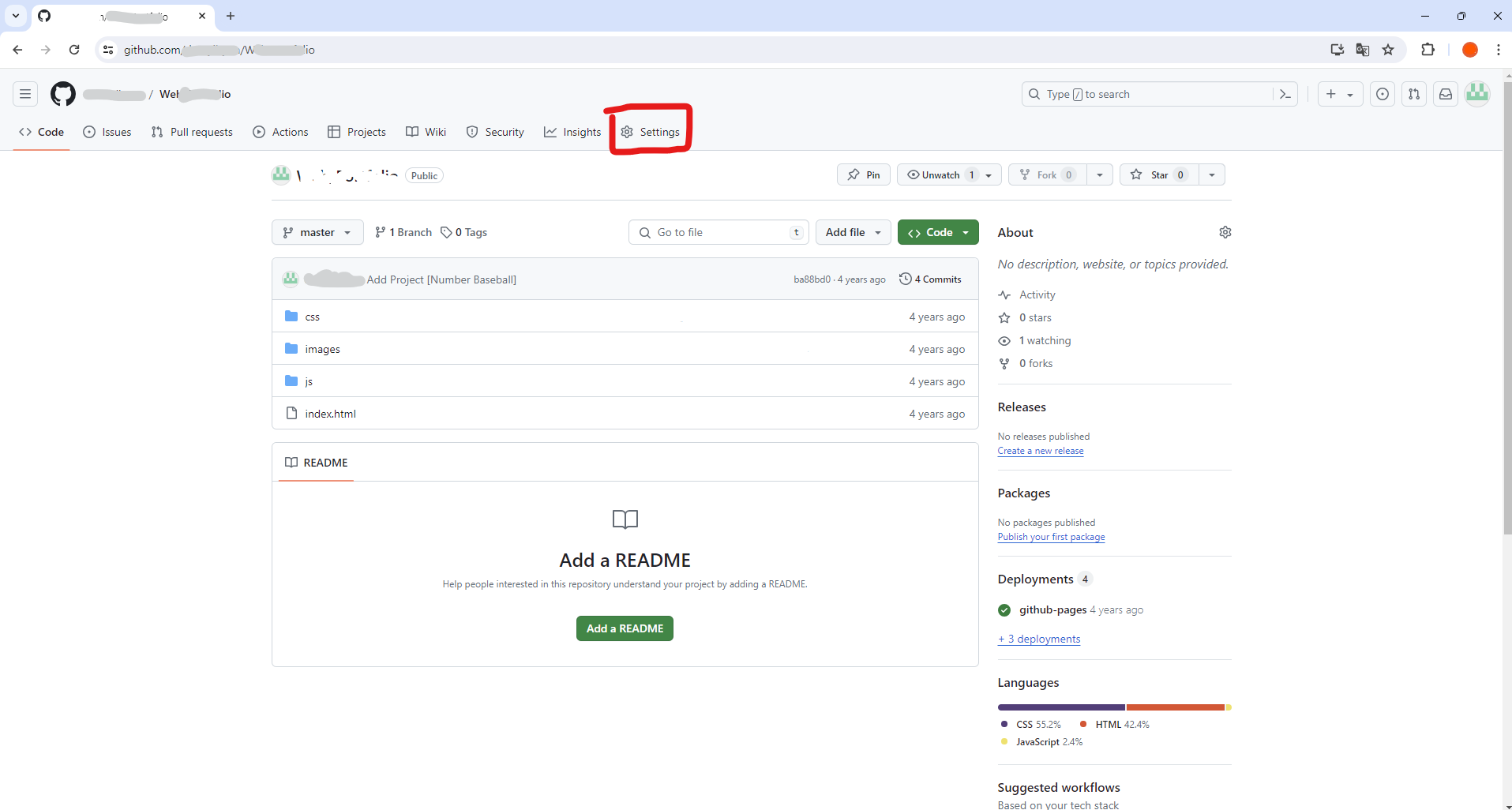 공개/비공개로 바꾸고 싶은 repository에서 settings 클릭
