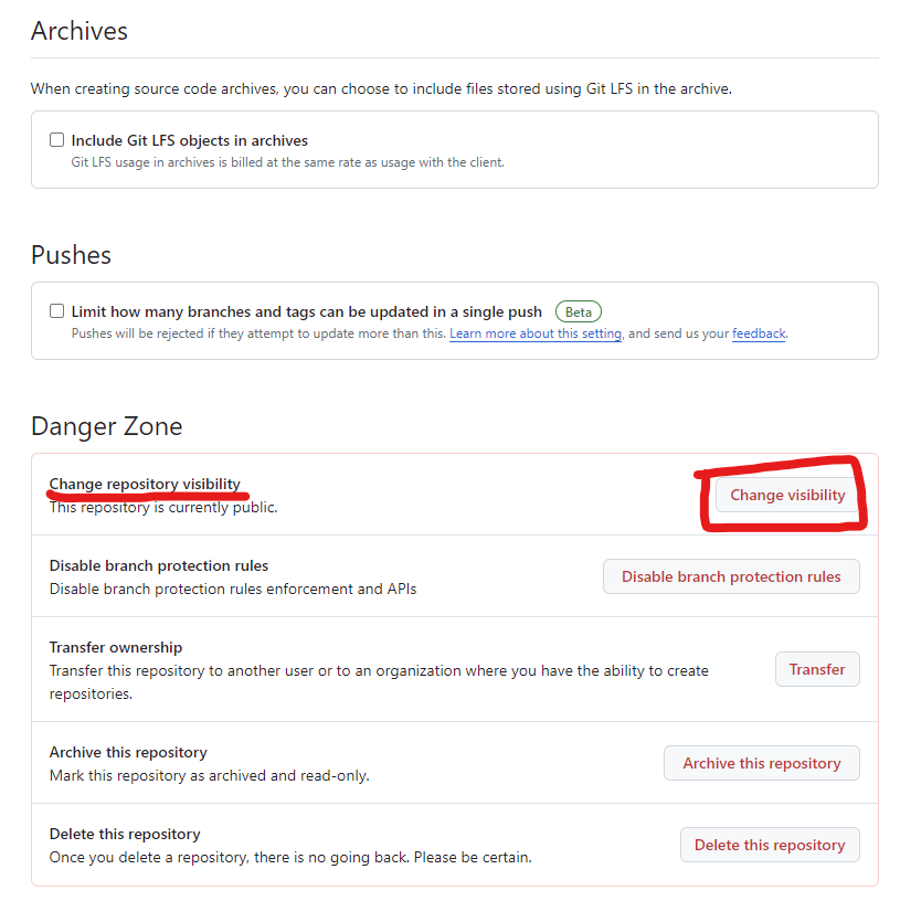 Danger Zone에서 Change repository visibility의 Change visibility를 클릭