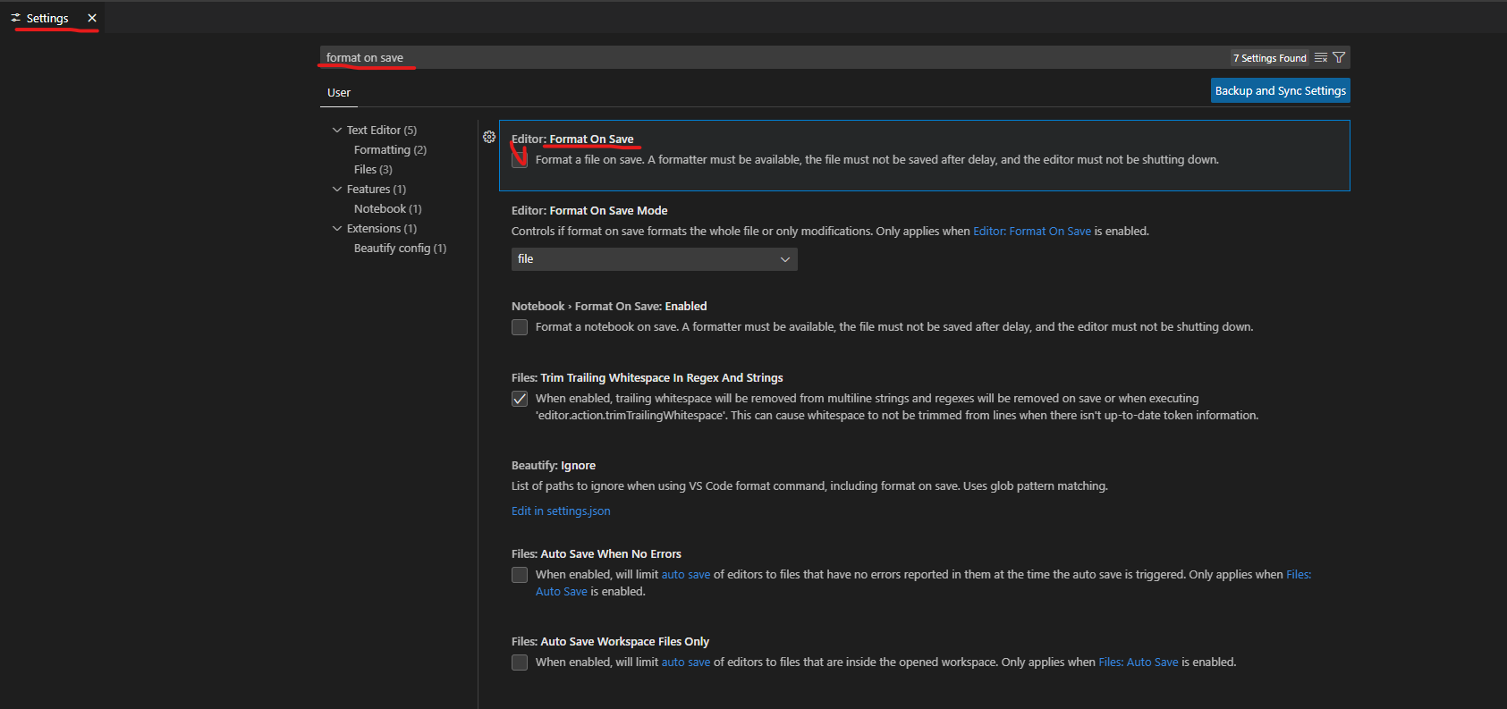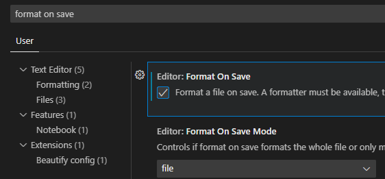 Format on save를 설정하면 코드를 저장했을 때 코드가 자동으로 정리된다.