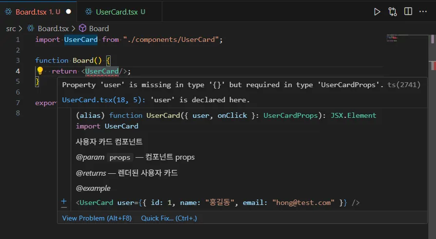 * <UserCard user={{ id: 1, name: "홍길동", email: "hong@test.com" }} />