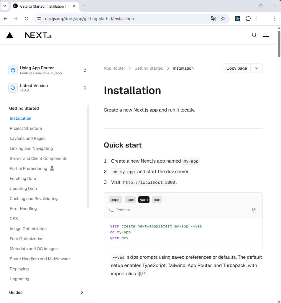 그래서 next.js 공식문서 보면서 프로젝트 설치를 진행 중이었다.
