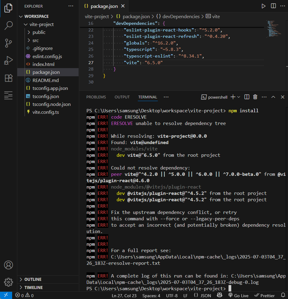 [E-LOG] Vite 다운그레이드 중 ERESOLVE 의존성 충돌 오류 본문