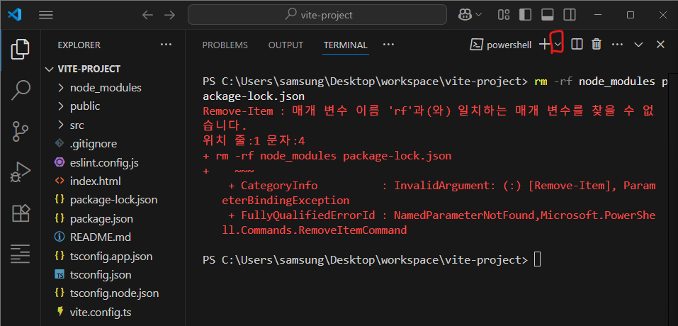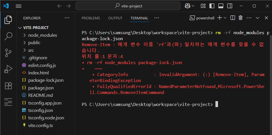 node_modules와 package-lock.json 파일을 삭제하기 위해 명령어를 입력하니 오류가 발생했다.