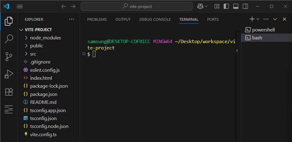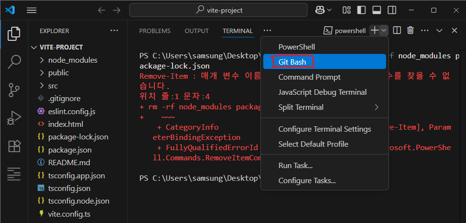 powershell이 아닌 bash를 사용해야 한다.